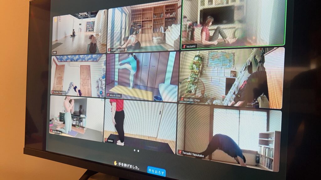 練習中、集中がプツっときれて、マットの上の自分を俯瞰したときに、『先生がいて、みんながいてる 画面にも、たくさんの練習生』その有難い優しい環境に気づいたとき。